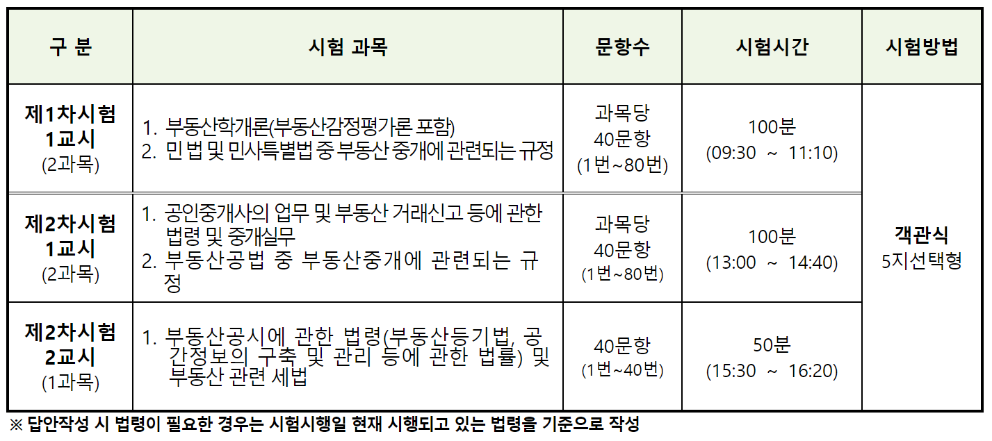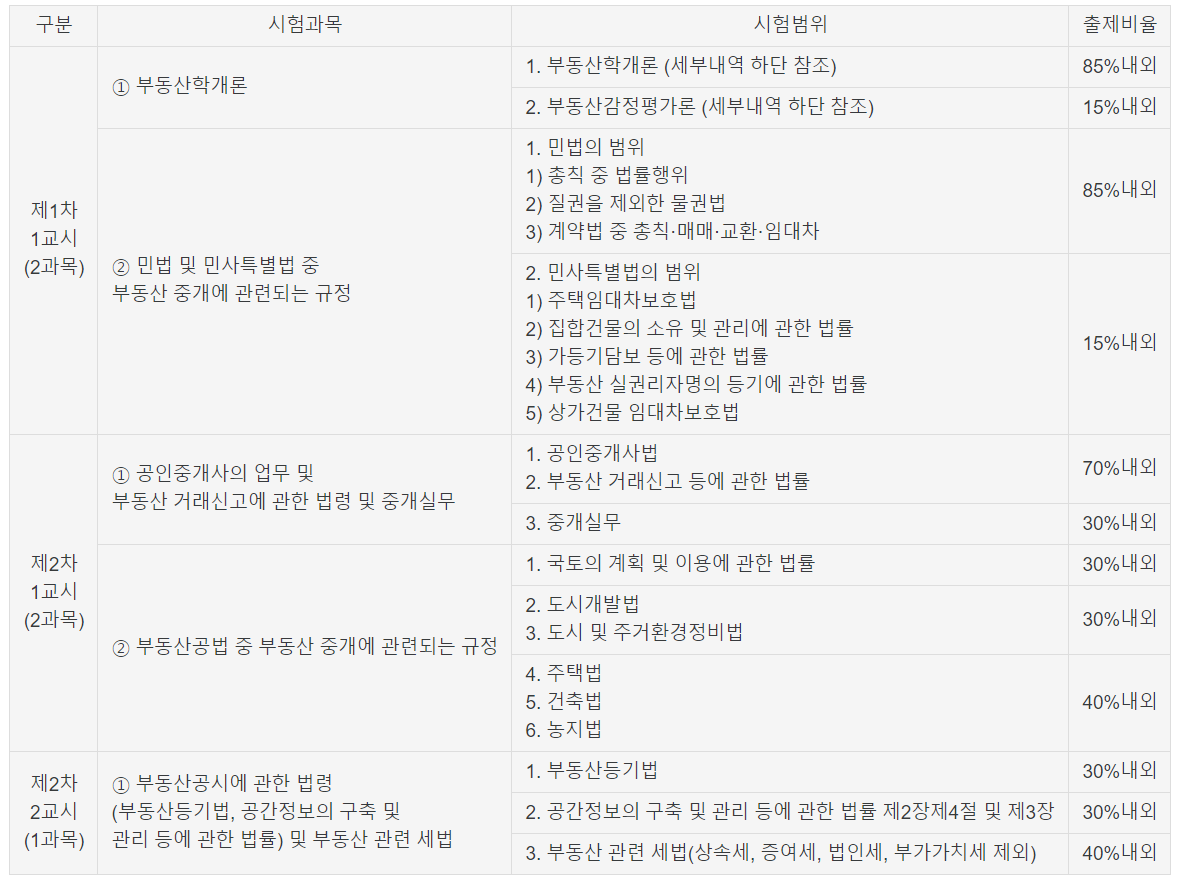 1차 2차 모두 총 5과목공시법과 세법까지 나누면 6과목 이지만 사실상 민법, 민사특별법, 부동산학개론, 공인중개사법, 공간정보의 구축 및 관리 등에 관한 법률, 부동산등기법, 세법, 국토계획법, 도시개발법, 도시및 주거환경 정비법, 건축법, 주택법, 농지법 등으로 세분화 됩니다. 학습범위가 상당히 광범위하므로 정답률 높은 프로그램을 선택하는 것이 유리합니다.