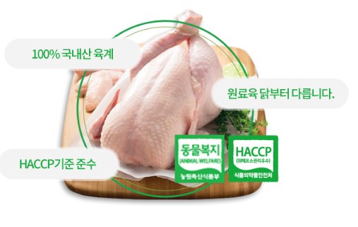 국가가 부여하는 최상위 인증제도인 국내산동물복지 닭고기를 사용해