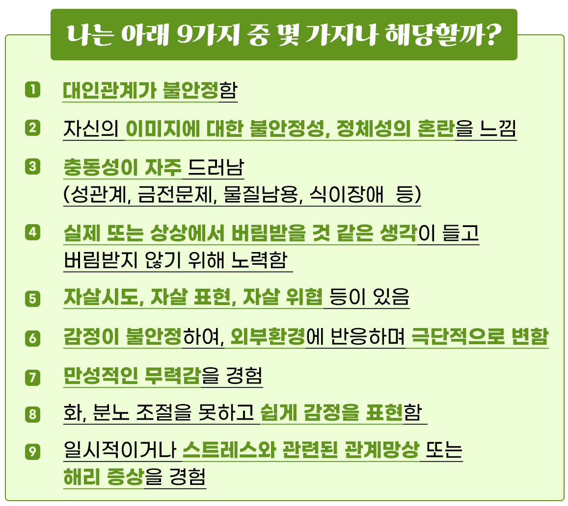 다음 항목 중 5개 이상 만족하면 경계성 인격장애로 판단합니다.