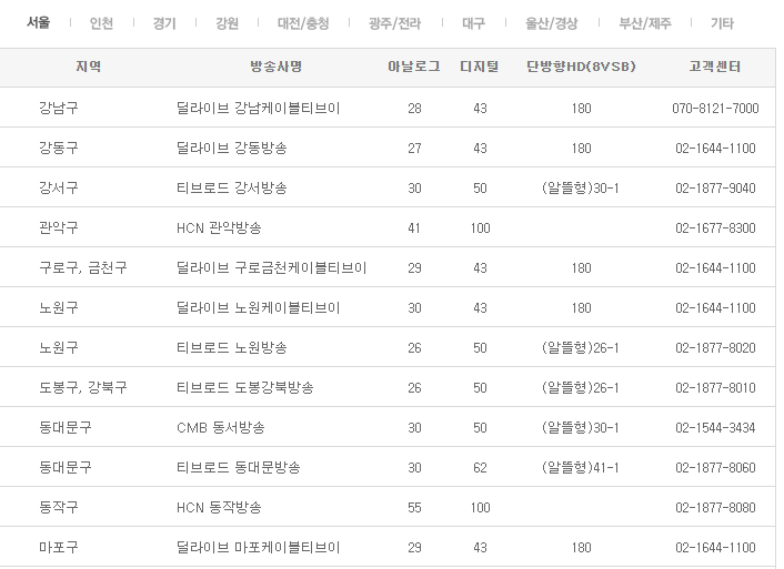 지역별 채널번호