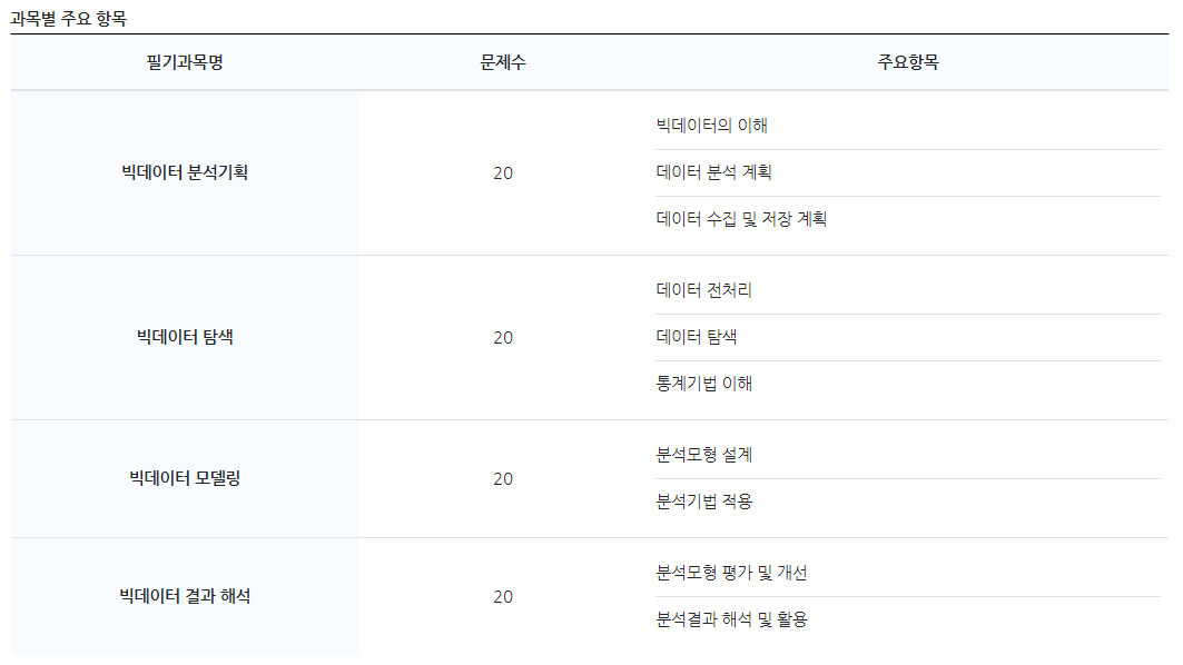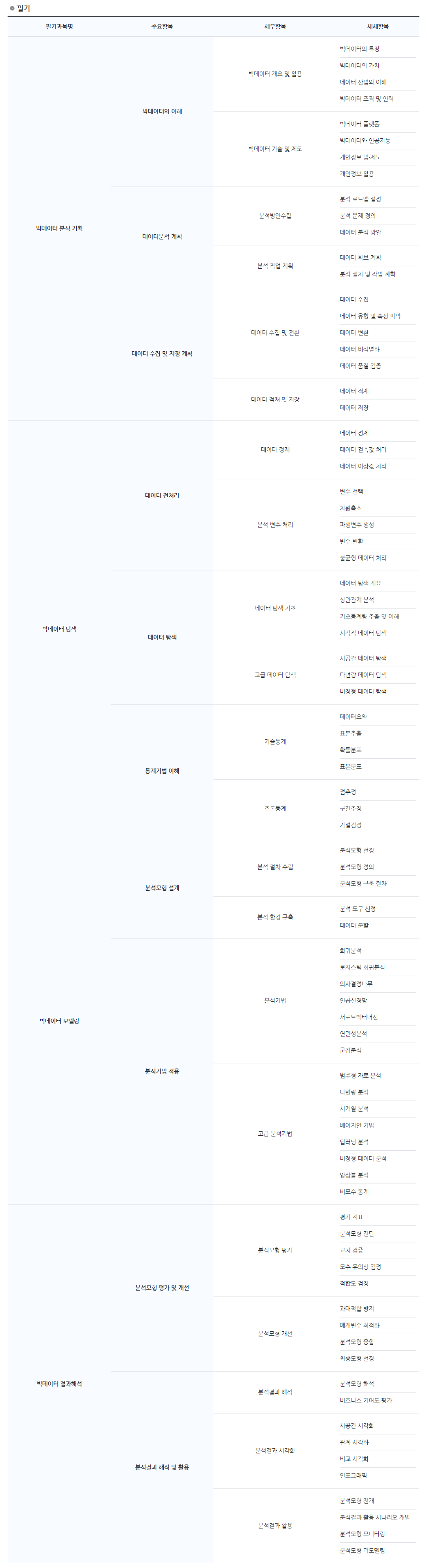 (필기) 빅데이터 분석 기획, 빅데이터 탐색, 빅데이터 모델링, 빅데이터 결과해석 등 4개 과목