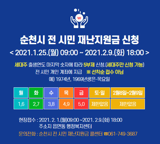 ✔ 문의전화 : 순천시 전 시민 재난지원금 콜센터 ☎061-749-3687, 주소지 행정복지센터