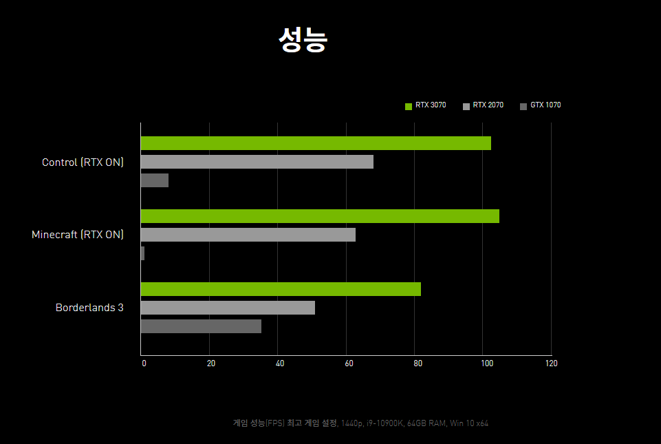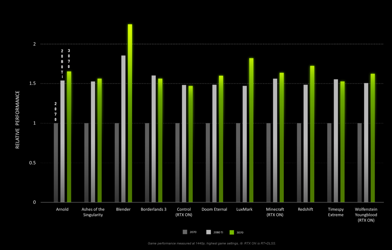 GeForce RTX 3070은 NVIDIA Reflex 및 Broadcast를 포함한 놀라운 성능과 기능을 $499에 제공합니다. 다양한 레이 트레이싱 및 래스터 화 된 DirectX 및 Vulkan 타이틀에서 GeForce RTX 3070은 GeForce RTX 2080 Ti (가격이 두 배로 판매됨)와 비슷하거나 더 빠른 성능을 제공하며 원래 GeForce RTX 2070보다 평균 60% 더 빠릅니다.