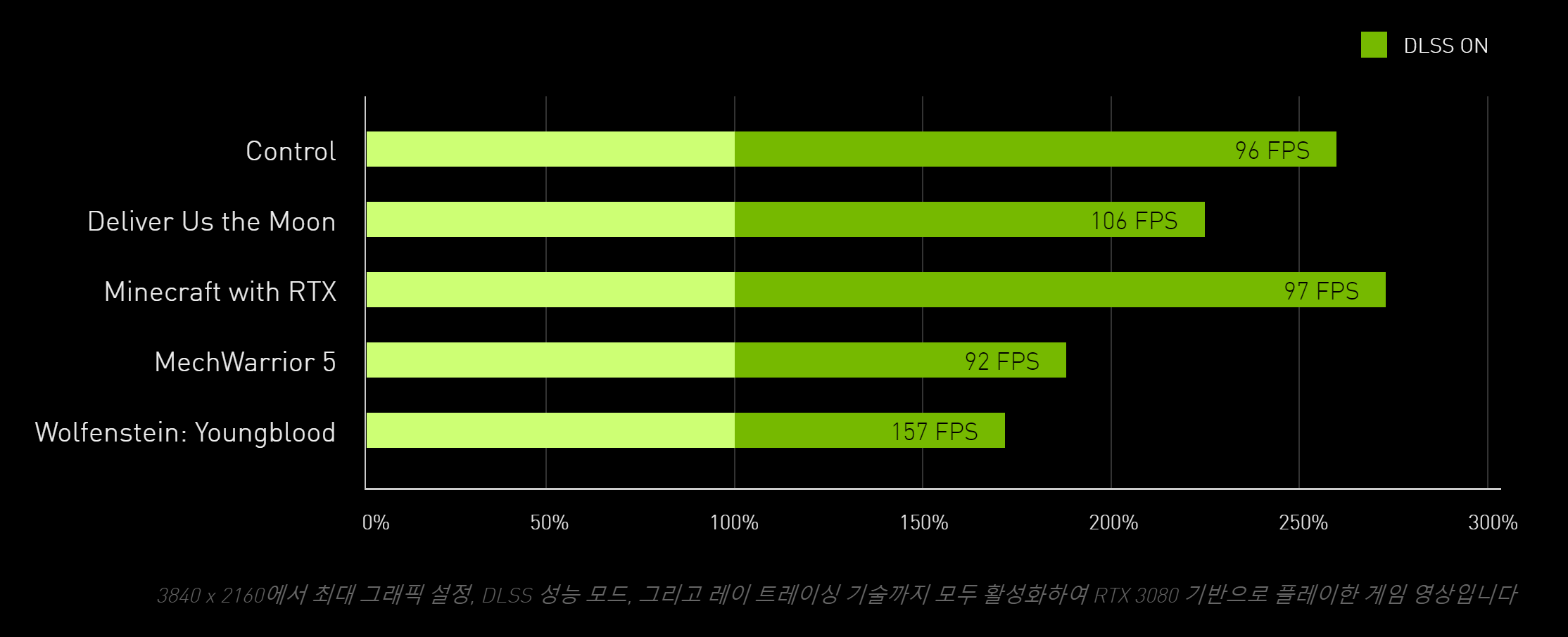 NVIDIA Deep Learning Super Sampling(DLSS)은 GeForce RTX™ GPU에서 전용 Tensor 코어 AI 프로세서를 사용하여 완전히 새로운 수준의 비주얼 충실도를 제공하는 획기적인 AI 렌더링 기술입니다. DLSS는 딥 러닝 뉴럴 네트워크의 성능을 활용하여 프레임 레이트를 높이는 동시에 아름답고 또렷한 게임 이미지를 생성합니다. 아울러, 레이 트레이싱을 최대로 설정하고 출력 해상도를 높일 수 있는 성능 헤드룸까지 제공합니다.