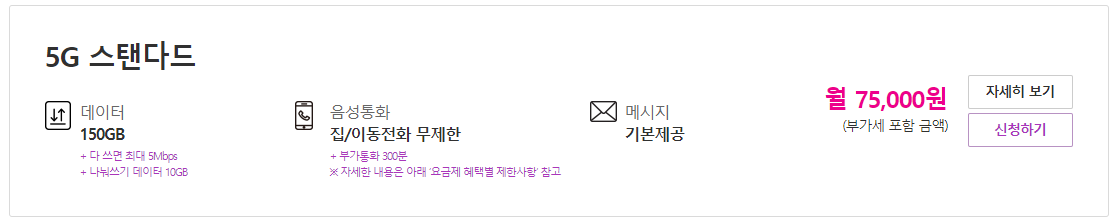 넉넉한 데이터로 U+5G 서비스를 이용할 수 있는 5G 표준 요금제