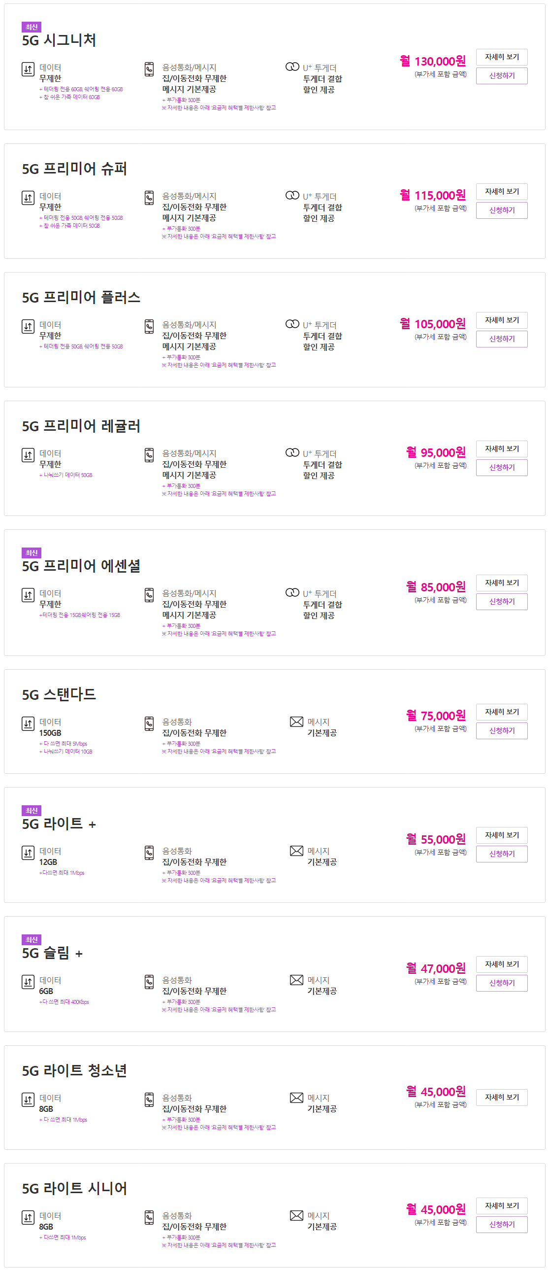 LG 유플러스 5G 요금제는 총 14개의 상품으로 구성되어 있습니다.