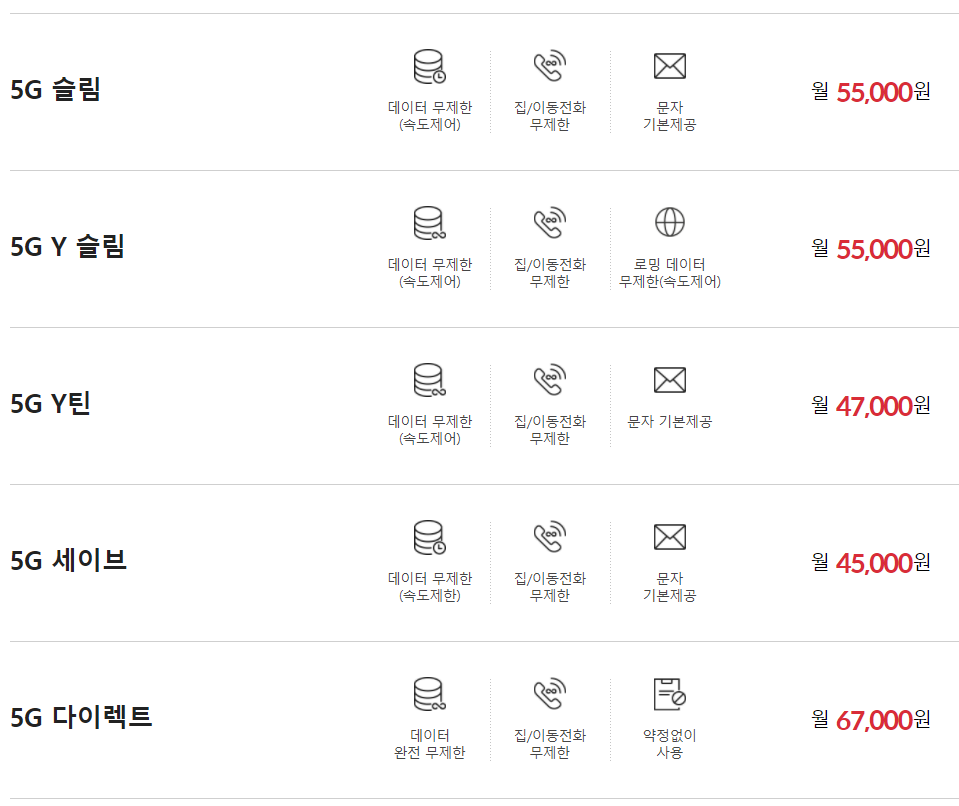5GX플래티넘, 5GX프라임, 5GX스탠다드, 슬림 요금제