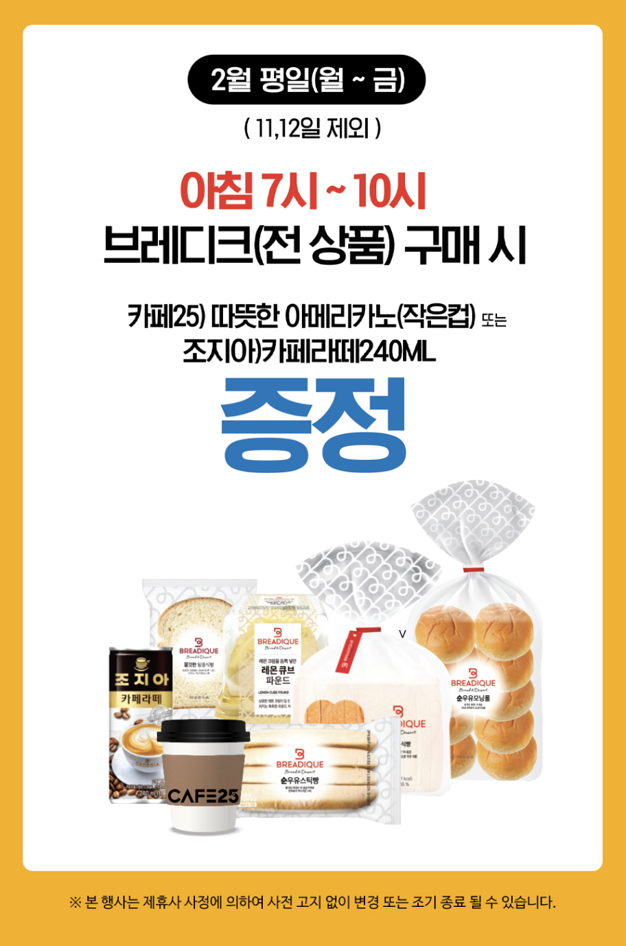 평일 아침 브레디크 전 상품 구매 시 커피 증정!