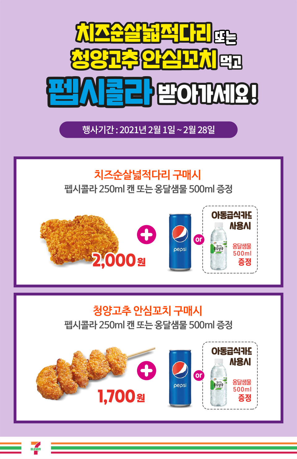 치즈순살넓적다리 또는 청양고추 안심꼬치 먹고 펩시콜라 받아가세요