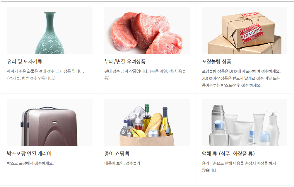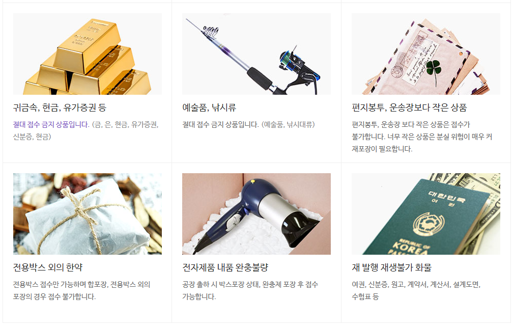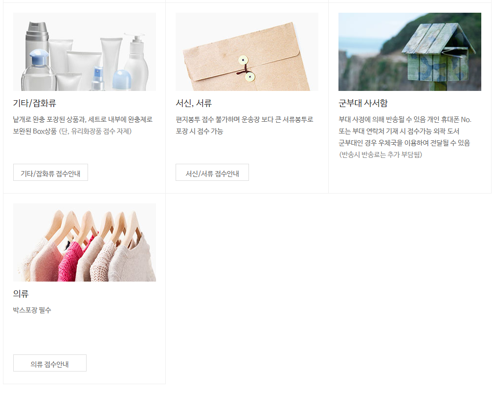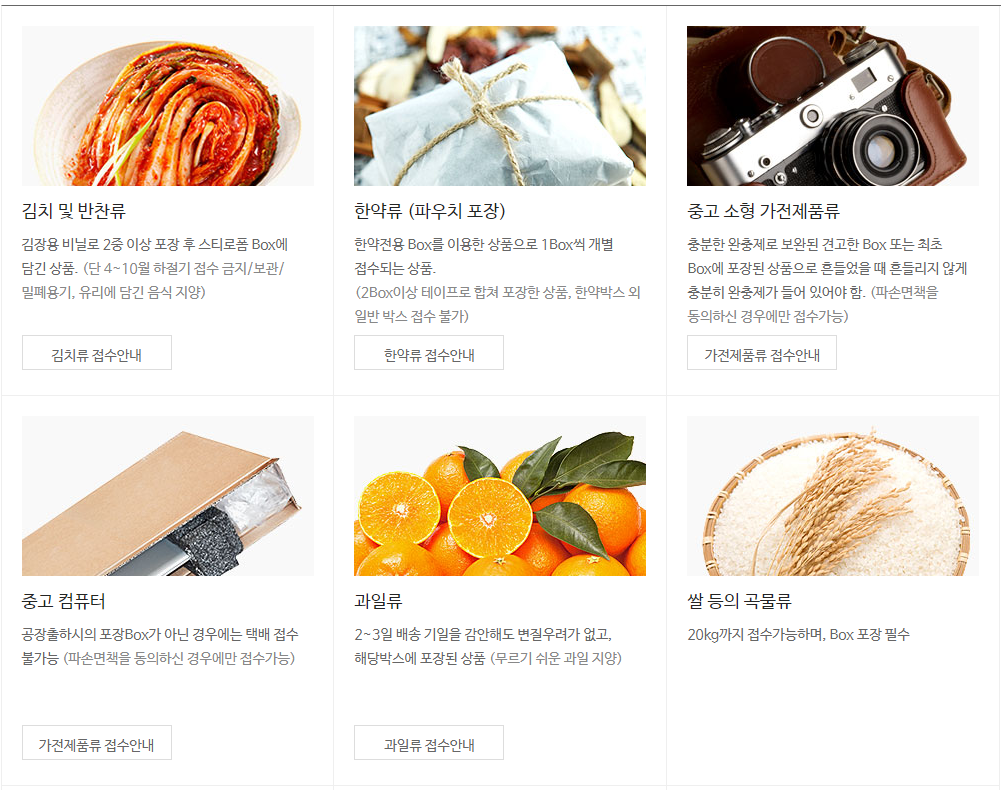 모든 택배 상품은 내용물을 보호할 수 있도록 박스로 포장되어야 합니다. 부피가 작은 상품의 경우 운송장보다 큰 소형박스에 재포장하여 접수하셔야 하며, 박스에 포장한 택배상품의 규격은 가로, 세로, 높이의 합이 160cm 이내이고 한 변의 길이가 1m 이내인 30kg 이하 상품에 한해 접수 가능합니다.