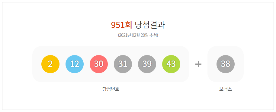 '2, 12, 30, 31, 39, 43'가 1등 당첨번호로 결정되었으며