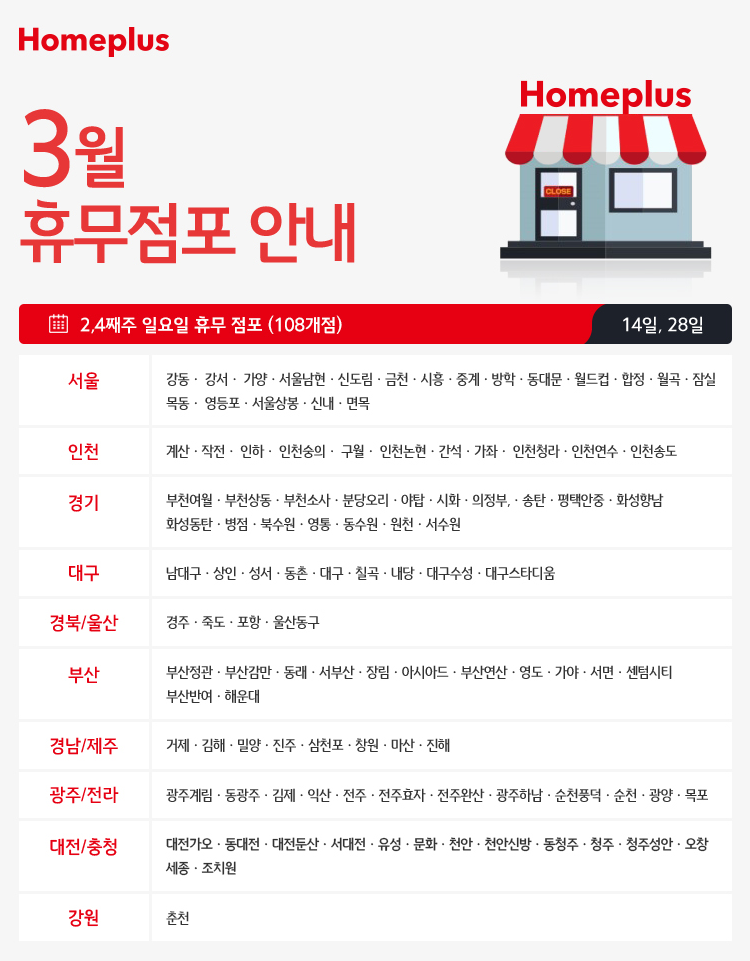 2021년 3월 홈플러스 휴무일에 대해 알아보도록 하겠습니다.