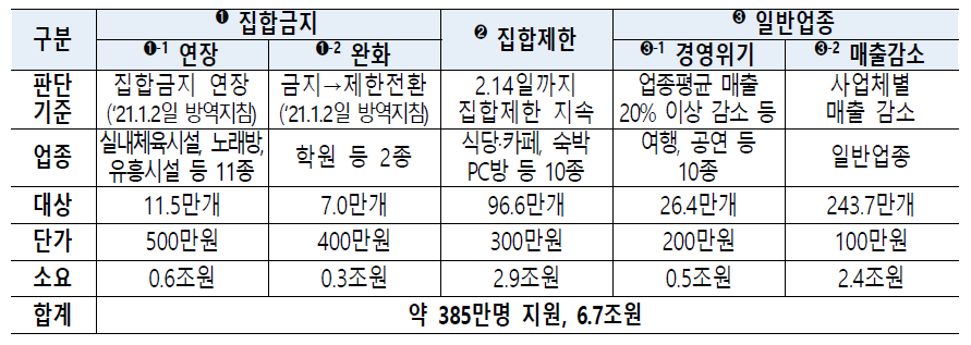 1. 집합금지(연장) : 실내체육시설, 노래연습장, 유흥업소 11종(11.5만개)