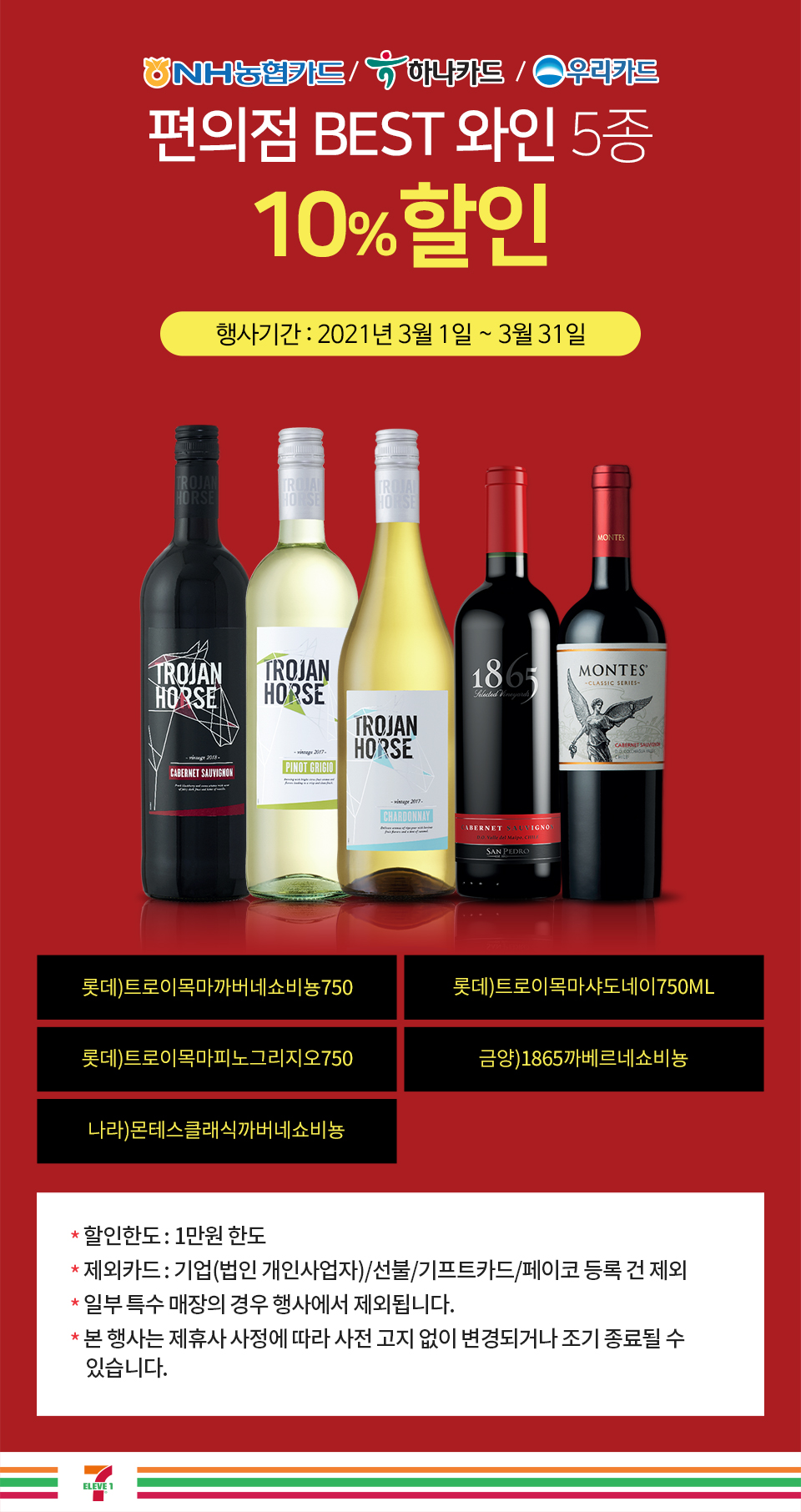 농협카드, 하나카드, 우리카드 편의점 BEST 와인 5종 10% 할인