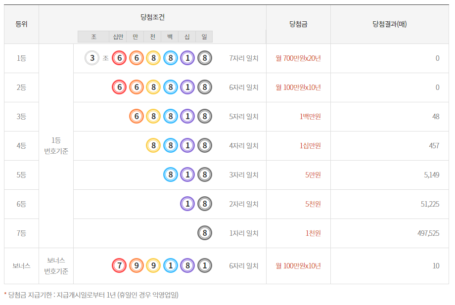 1등(월 700만원×20년) 3조 6, 6, 8, 8, 1, 8