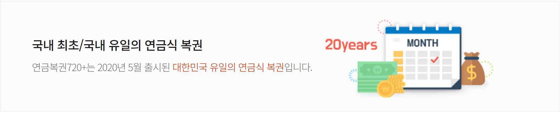 - 연금복권720+는 1등 당첨금을 매 월 700만원씩 20년간 연금식으로 지급하여 당첨자의 안정적 생활을 보장합니다.