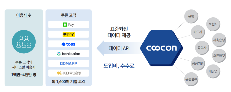 2006년 설립된 기업 쿠콘은 디지털 혁신의 기본인 데이터를 수집·연결하고 표준화 형태 API(Application Programming Interface)로 제공하여 수익을 창출 중입니다. 금융, 공공, 의료, 물류, 유통, 통신 등 국내 500여개 기관, 해외 40여 국가, 2,000여개 기관으로부터 비즈니스 데이터를 수집·연결하고 있으며, 주요 고객은 금융기관과 빅테크·핀테크 기업 등으로 총 1,600여개 고객사를 확보했으며 현재 데이터 서비스, 페이먼트 서비스를 통합 제공하고 있습니다. 수많은 종류의 데이터 서비스와 국내 최다 금융기관이 연결된 페이먼트 서비스 기반을 통해 독보적인 경쟁력을 보유 중이며, 고객은 쿠콘을 통해 필요한 데이터를 일괄적으로 제공받을 수 있어 서비스 편리성이 뛰어난 점이 큰 장점으로 알려져 있습니다.