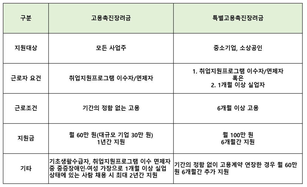 <고용촉진장려금 vs 특별고용촉진장려금 비교표>