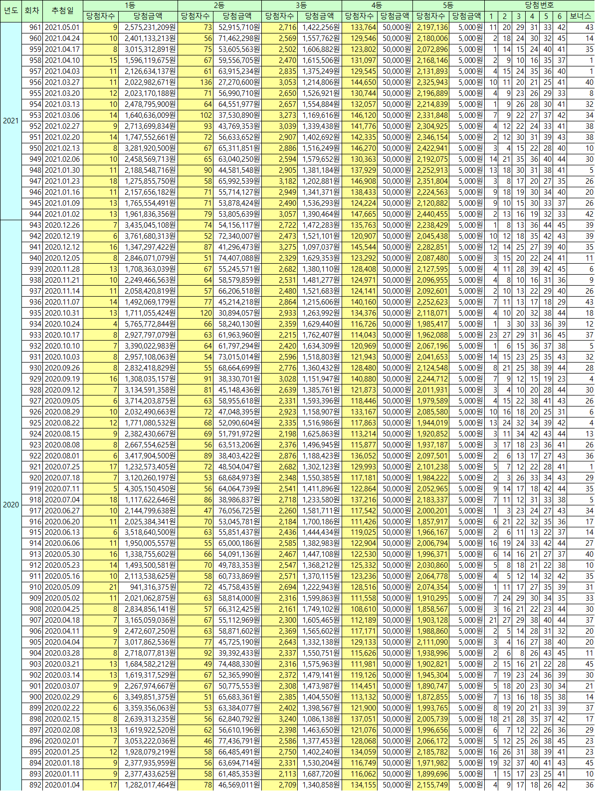 961회 로또 당첨번호 당첨지역 제961회 동행복권 로또 추첨 결과 '11,20,29,31,33,42'가 1등 당첨번호로 결정됐습니다. 2등 보너스 번호는 '43'입니다. 당첨번호 6개 숫자를 모두 맞힌 1등 당첨인은 9명으