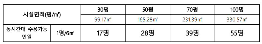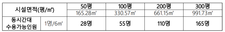 * (1단계) 개별 돌잔치 단위 이용면적 4㎡당 1명, (2단계) 개별 돌잔치 단위 100인 미만 + 4㎡당 1명