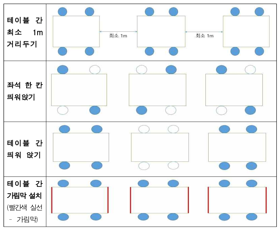 * 1단계 수용인원의 50%(한 칸 띄우기), 2단계 30%(두 칸 띄우기), 3단계 20%(네 칸 띄우기), 4단계 비대면