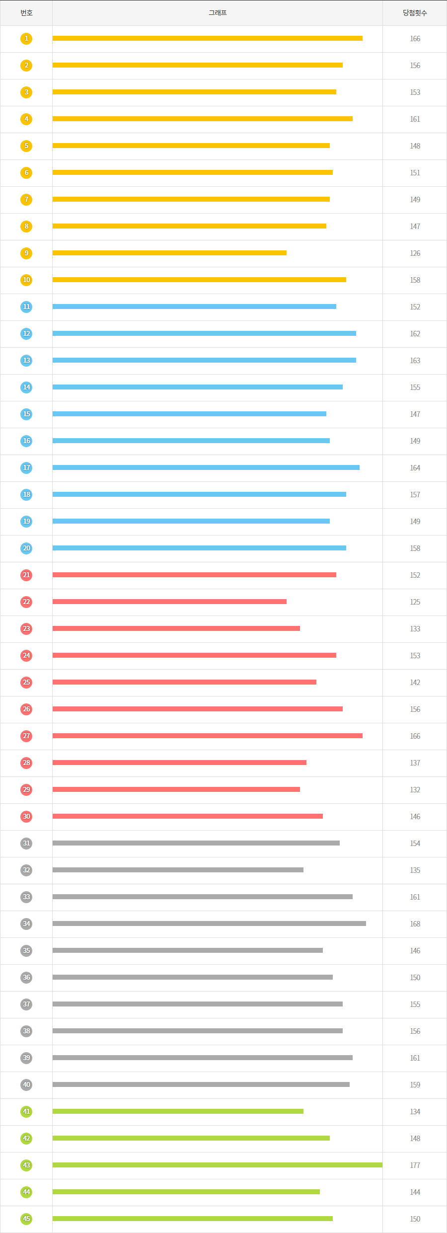 1번부터 45번까지 당첨횟수 순서로