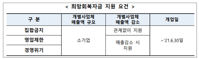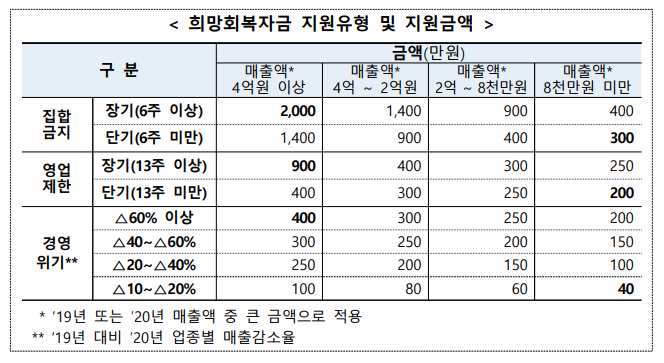 [희망회복자금 지원유형 및 지원금액]