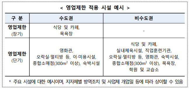 * 예) ① 21시 ~ 05시까지 영업금지, ② 호텔 객실 50% 미만 영업