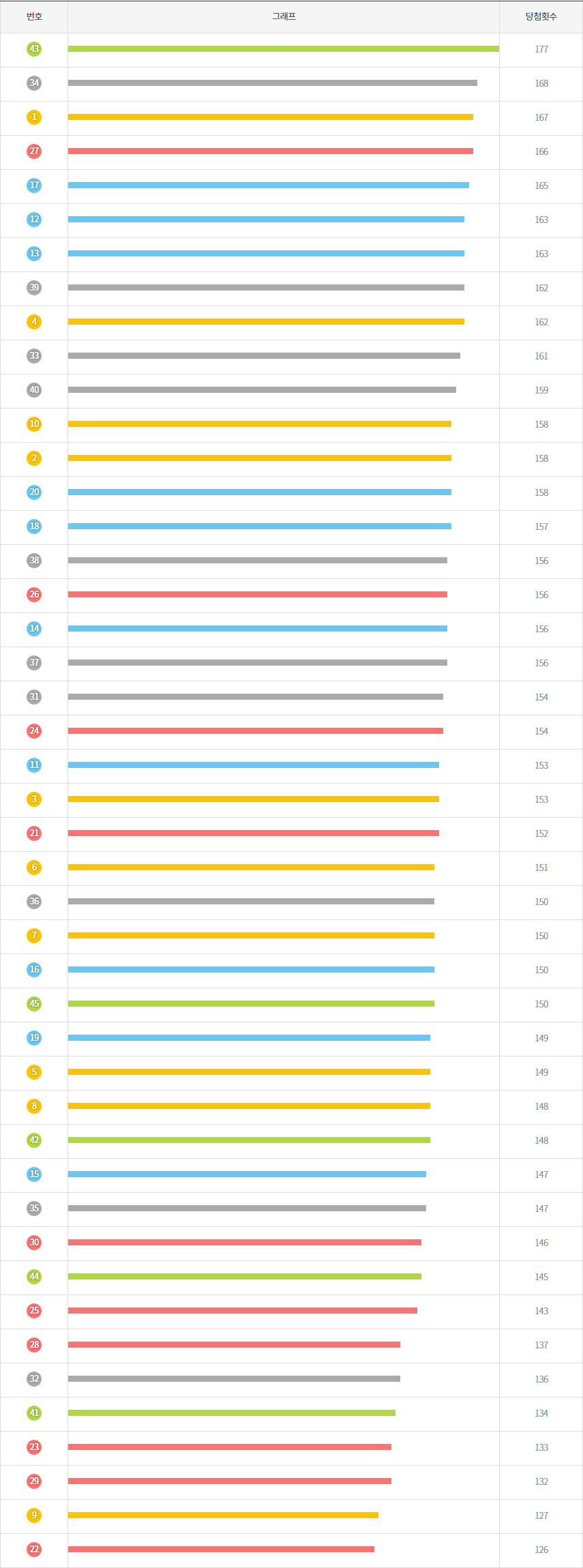 1번부터 45번까지 당첨횟수 순서로