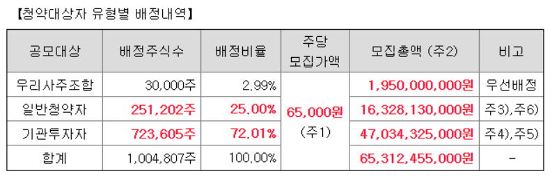 경쟁률이 매우 높은 편이며 일반 개인 투자자 대상으로 배정되는 수량 중 50%는 균등, 50%는 비례 방식으로 배정됩니다. 균등 최소 단위는 10주 신청 시 50%인 32,5000원이 증거금으로 필요합니다.