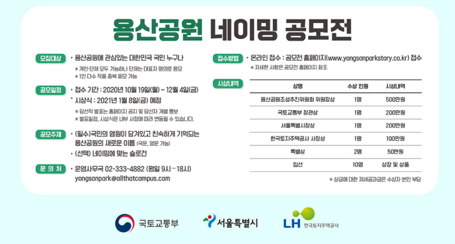 용산공원 네이밍 공모전 : 2020.10.19(월) ~ 12.04(금)