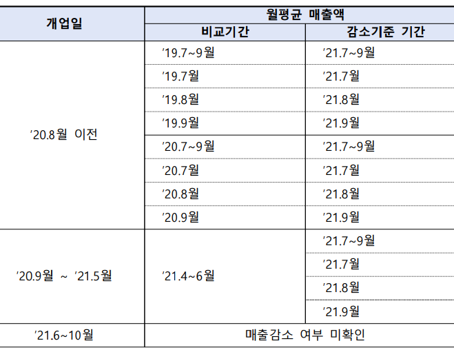 비교기간 대비 ’21.7~9월 월평균 매출액 감소가 원칙이며, 비교기간 매출액이 없는 ’21.6~10월 개업자는 매출감소 여부 미확인