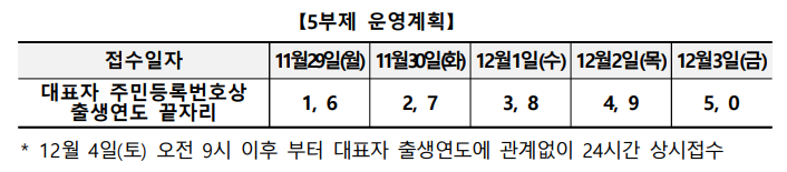 - 자금 개시 첫 주(11.29~12.3)간 5부제 운영(09시~24시 접수)