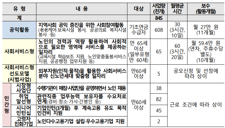이번에 모집하는 사업은 공익활동, 사회서비스형, 시장형 사업단으로 만 60세 또는 만 65세 이상이라면 조건에 따라 신청이 가능합니다.