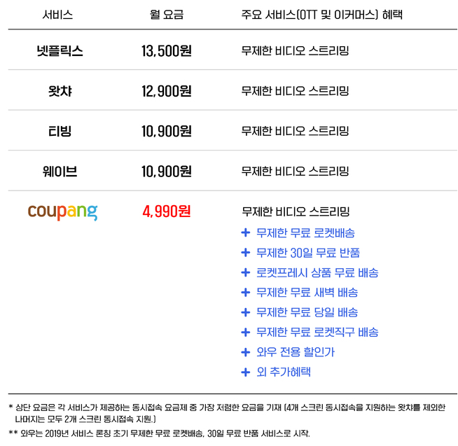 월 2,900원이라는 파격적인 금액에 쿠팡 와우멤버십뿐만 아니라 다양한 컨텐츠를 즐길 수 있다는 것은 비교할 수 없는 매력적인 서비스라는 평가입니다. OTT시장의 경쟁사들인 넷플릭스와 왓챠, 웨이브등의 가격 및 무료체험 관련 내용을 비교한 표입니다.