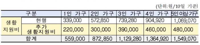 [재택치료 기간 10일을 기준으로 가구별로 지급되는 추가 생활지원비]