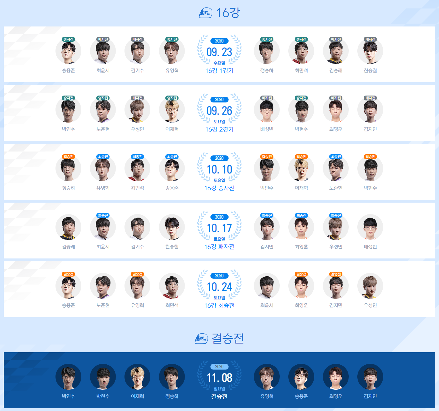 개인전 결승에는 치열한 레이스를 뚫고 올라온 박인수, 박현수, 이재혁, 정승하, 유영혁, 송용준, 최영훈, 김지민 8명 선수가 나섭니다. 이 중 유영혁, 이재혁 선수를 제외하면 나머지 6명은 개인전 첫 우승 도전인 만큼 새로운 황제가 탄생할지 이목이 집중되고 있습니다.