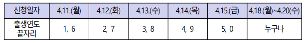 - 4.11(월)∼4.15(금) 5일간은 출생연도 끝자리에 따른 5부제 시행