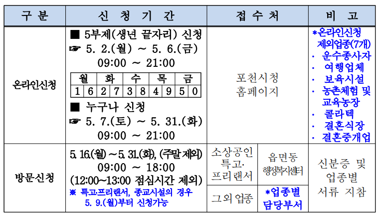- 신청자가 많은 경우 지급이 지연될 수 있으며 업종별 예산범위에서 신청접수 또는 지급시기가 변경될 수 있음