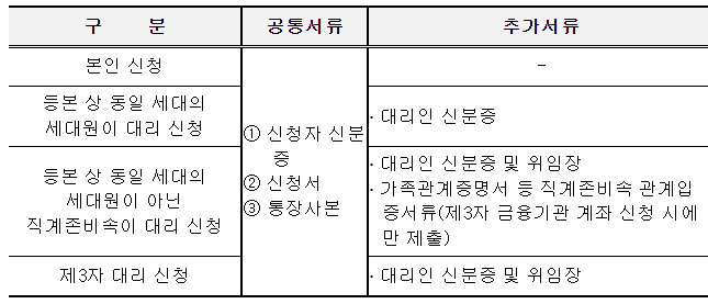 - 등본 상 동일 세대의 세대원 중 세대주와의 관계가 ‘동거인’인 경우에는 ‘제3자 대리 신청’ 구비서류 지참
