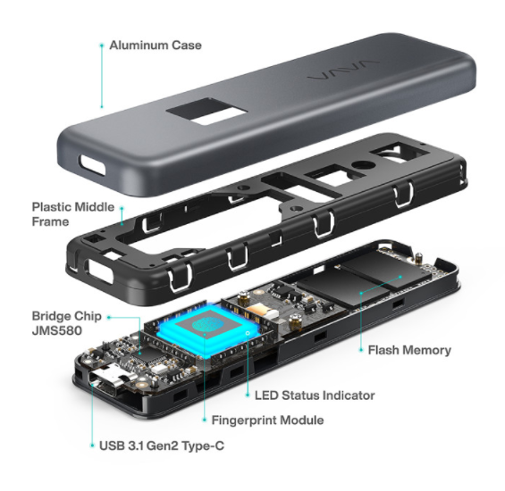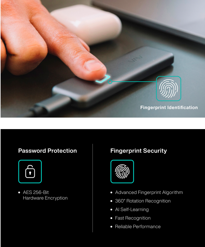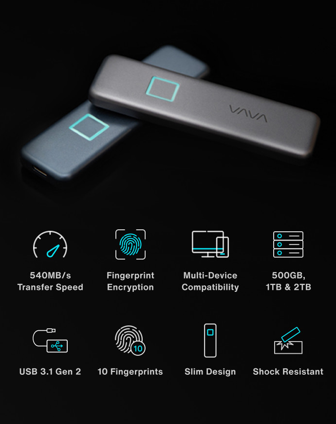 VAVA Portable SSD Touch는 세계에서 가장 진보된 암호화 기술인 AES 256비트 하드웨어 암호화를 활용하여 데이터를 안전하고 침해할 수 없도록 유지합니다. 지문 판독기는 드라이브의 데이터에 생체인식 보안 계층을 추가한다. 지문 인증 또는 사용자 생성 암호를 사용하여 잠금 해제할 수 있습니다. 또한 10개의 지문 등록이 가능하므로, 팀 프로젝 트시에도 문제없이 사용이 가능합니다.
