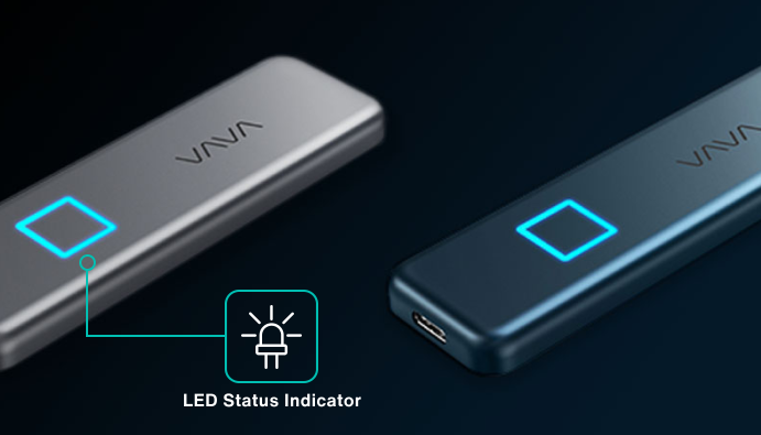 VAVA SSD Touch는 장치를 사용할 때 빛을 내는 LED가 적용되어 있습니다. 데이터 전송 중에는 조명이 파란색으로 깜박이고 오류가 발생하면 빨간색으로 깜박이기 때문에 장치를 한눈에 파악할 수 있습니다.