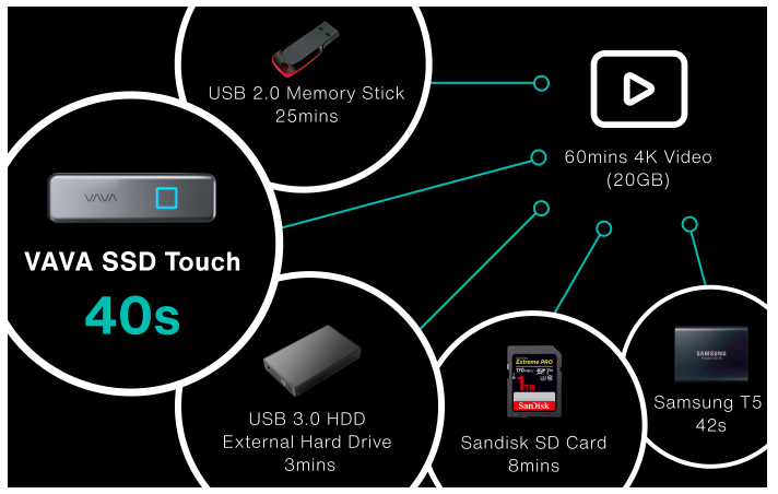 USB 3.1 Gen2 VAVA SSD Touch의 초고속 속도로 단 20초 만에 10GB의 데이터 전송이 가능합니다. 최대 540/480MB/s의 읽기/쓰기 속도를 특징으로, 표준 하드 디스크 드라이브(HDD)보다 4.9배 빠릅니다.