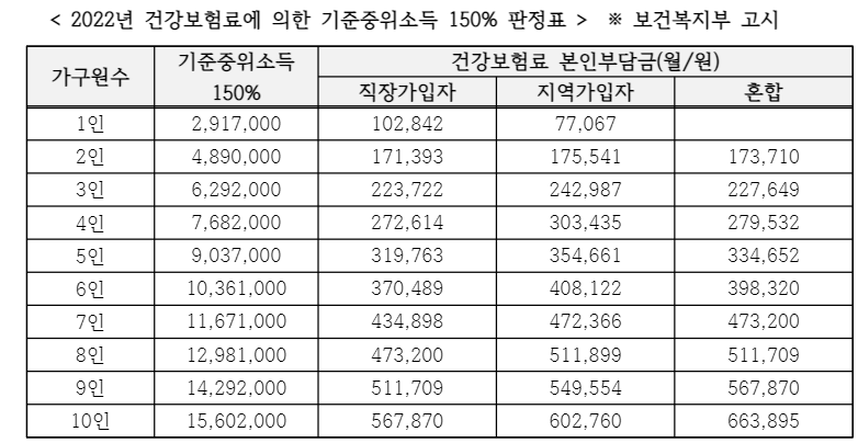 - 기준중위소득 150% 판정기준으로 가구 구성원의 건강보험료 (‘22. 2월~4월분) 합산 금액 비교