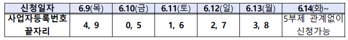 - (신청분산) 6.9일(목)부터 6.13일(월)까지 첫 5일간 사업자등록번호 끝자리 기준으로 5부제 시행, 6.14일(화)부터는 사업자등록번호 끝자리와 관계없이 신청