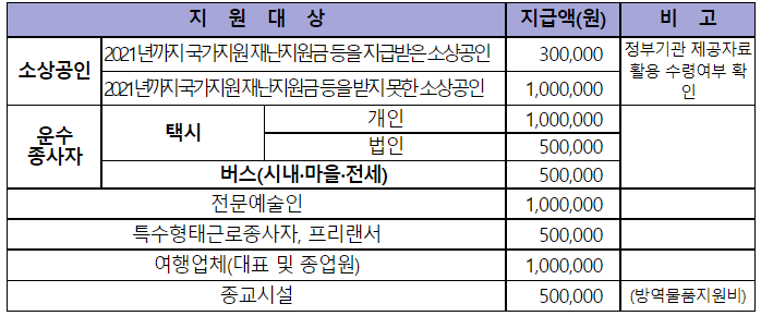 - 군포시 관내에 등록된 사업장에 종사하고 있는 사람 (법인‧개인택시‧버스 운수종사자, 여행업체)