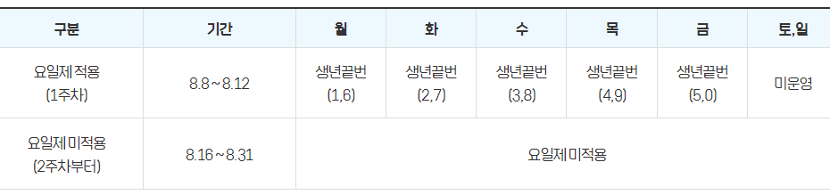 5부제 미적용 : 8. 8. ~ 8. 31. 09:00 ~ 22:00