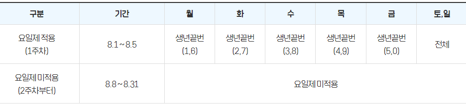 5부제 적용 : 8. 1. ~ 8. 5. 09:00 ~ 22:00