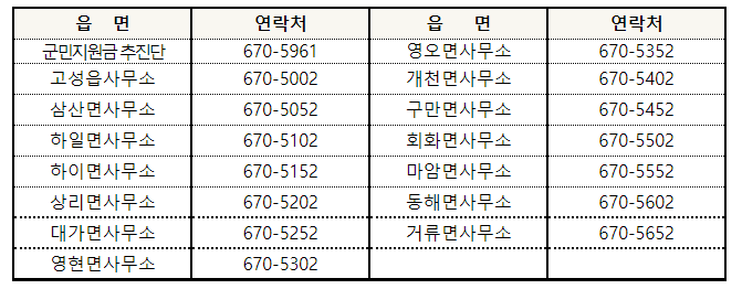 고성군청(52943) 경상남도 고성군 고성읍 성내로 130 대표전화055-670-2114 ⓒ Goseong-gun, Gyeongsangnam-do All Rights Reserved.
